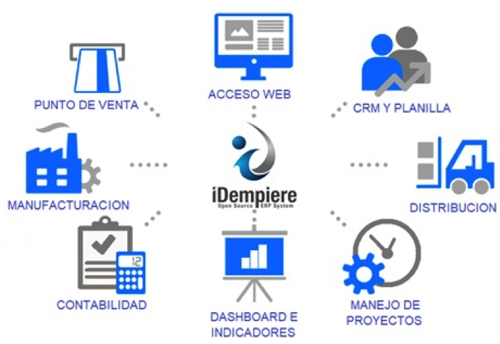 Idempiere se implementa rápidamente y en cuestión de horas el empresario ya puede empezar a facturar. Es una solución 100% en la nube, de cobertura mundial, con localización Colombia; por lo que todos los temas, legales y contables se ciñen a las normas del país.