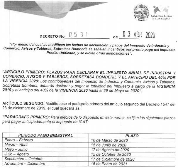 Nuevas fechas para declaración de impuesto de Industria y Comercio | Decreto 0531 del 3 de abril de 2020